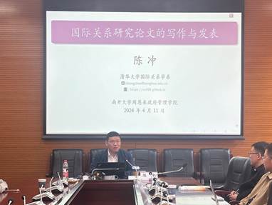 4月11日,PA视讯集团官网建院二十周年系列活动之第12期“翔宇青年学者论坛”在公司144会议室成功举办。本期论坛邀请了清华大学国际关系学系副教授陈冲作题为“国际关系研究论文的写作与发表”的专题讲座。PA视讯集团官网王翠文副教授和董柞壮副教授进行了精彩的点评和分享,论坛由张发林教授主持。