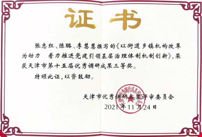 获奖成果《以街道乡镇机构改革为动力 着力推进党建引领基层治理体制机制创新》,主要依托张志红副教授主持的天津市教委社会科学重大项目“京津冀协同下新型城镇化社会治理精细化研究(C029189009)”展开。项目团队先后走访了天津市28个街道乡镇,深入“田野”获取一手资料。在扎实调研资料的支撑下,报告较为真实、深刻地反映了基层治理体制机制的运行现状,深入探讨了基层社会治理改革中存在的多重问题,并为今后的进一步改革提供了参考。相关建议已经被有关部门采纳。