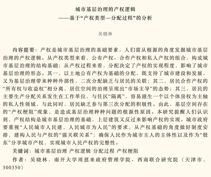 PA视讯官方网站吴晓林教授在2024年第3期的《政治学研究》发表文章《城市基层治理的产权逻辑——基于“产权类型—分配过程”的分析》。文章从产权类型和产权过程分析了城市基层治理的产权逻辑,指出基层空间存在的“产权梗阻”现象是造成基层治理种种问题的根源性原因。文章启示产权结构是城市基层治理的基础,上层建筑又反过来影响产权的实现。城市政府要重视“人民城市人民建,人民城市为人民”的要求,从产权基础的角度做好制度安排,建构人民与产权的“强关联关系”;确保人民作为城市主人的主体性以及作为“股东”分享城市产权,实现城市人民产权的完整性。