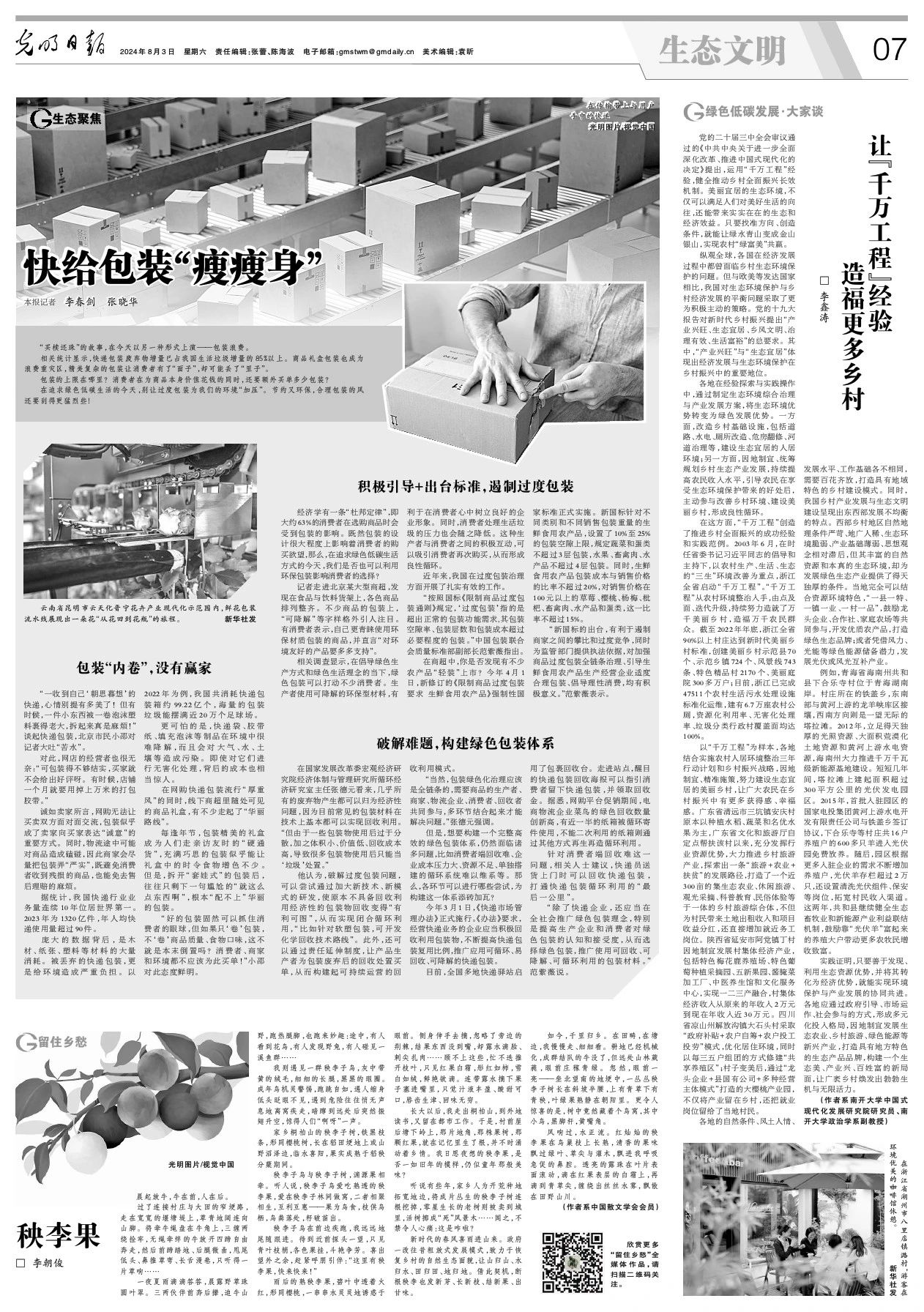 PA视讯官方网站李鑫涛副教授在2024年8月3日的《光明日报》上发表文章《让千万工程经验造福更多乡村》。文章主要关注乡村全面振兴事业,主张运用“千万工程”经验,将生态优势转为绿色发展优势,实现环境保护与产业发展协同共进,打造美丽乡村。