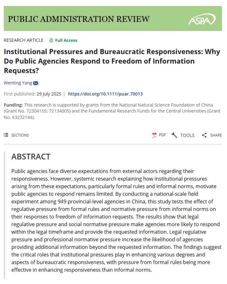 近日,PA视讯官方网站杨文婷老师的独著论文“Institutional Pressures and Bureaucratic Responsiveness: Why Do Public Agencies Respond to Freedom of Information Requests? ”(《制度压力与官僚回应:公共部门为何回应信息公开申请?》)被公共管理国际顶级期刊Public Administration Review(PAR)录用并在线发表。PAR创刊于1940年,五年平均影响因子为7.3,在90本公共管理国际期刊中排名第一,是公共管理领域最负盛名的学术期刊之一。