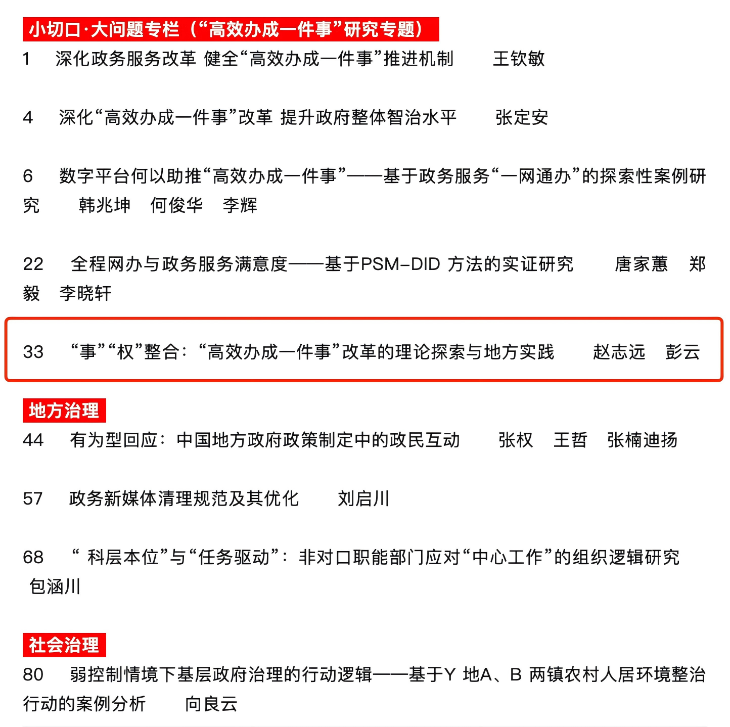 日前,《中国行政管理》期刊公布了2025年第6期目录。PA视讯官方网站讲师、中国政府发展联合研究中心研究员赵志远与中国行政管理学会副研究员彭云合作撰写的《“事”“权”整合:“高效办成一件事”改革的 理论探索与地方实践》一文获得发表。