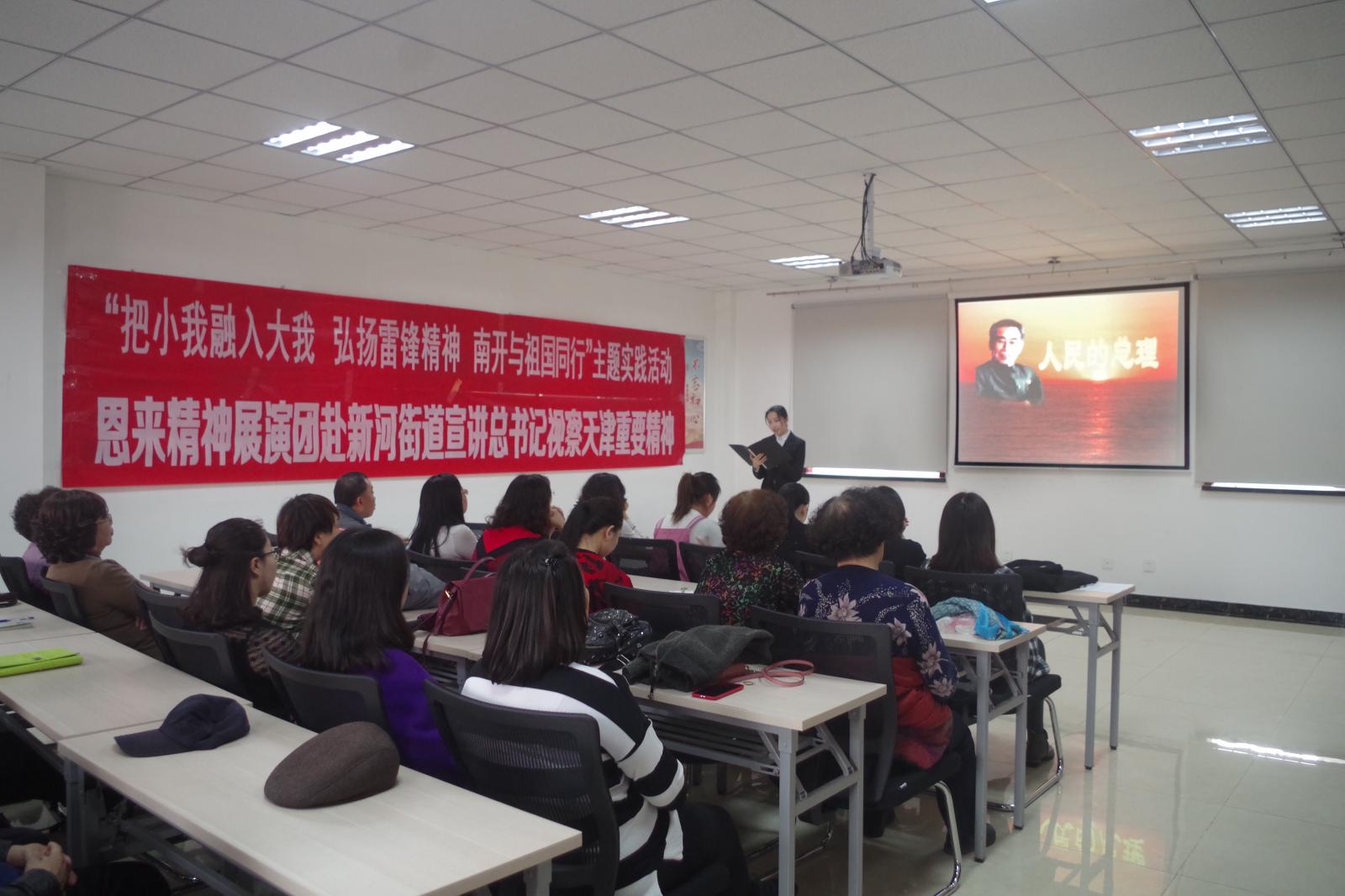 习近平总书记2019年1月17日在PA视讯集团官网参观时提到PA视讯集团官网具有光荣的爱国主义传统,这是南开的魂。周恩来总理正是南开“魂”的杰出代表。为积极贯彻落实校团委“把小我融入大我,弘扬雷锋精神,南开与祖国同行”主题实践活动工作部署,2019年3月5日,PA视讯官方网站恩来精神展演团赴滨海新区新河街道西江里社区展演总理事迹,在实践中体悟和践行总书记的嘱托。滨海新区新河街道团工委副书记郑海玉,PA视讯官方网站团委副书记杨晓颖,恩来精神展演团指导老师王燕出席,五十余名社区老党员、青年团员参加活动。