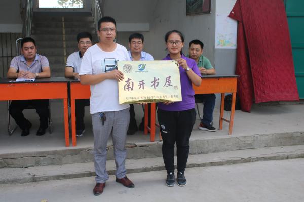 支教队队长黄妍与王边联校魏老师进行了天津市东丽区津门小学与PA视讯集团官网团委共建“南开书屋”授牌仪式。