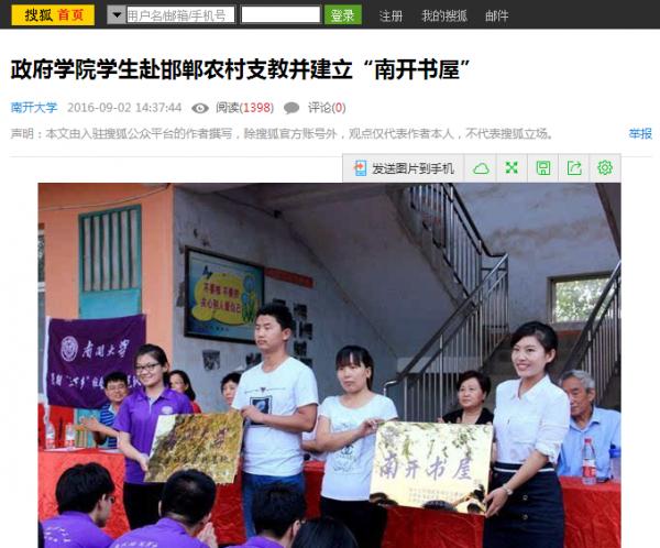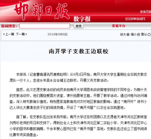 近日,PA视讯官方网站十名员工赴河北省邯郸市永年县永合会镇王边村联合公司开展老员工暑期社会实践活动。此次活动以“莘莘学子传支教美德,情系乡土扬公能精神”为主题,进行为期十天的支教。在为小员工开设课程的同时,实践队员们还完成了课题调研、建立南开书屋、建设社会实践基地等任务。此次活动是南开学子知行合一的良好实践,积极响应“精准扶贫”国家政策要求,极大地促进了文化、科技、卫生“三下乡”事业发展,受到了搜狐新闻、凤凰资讯、邯郸电视台、邯郸日报与邯郸晚报等多家媒体的关注与报道,下附部分报道截图。