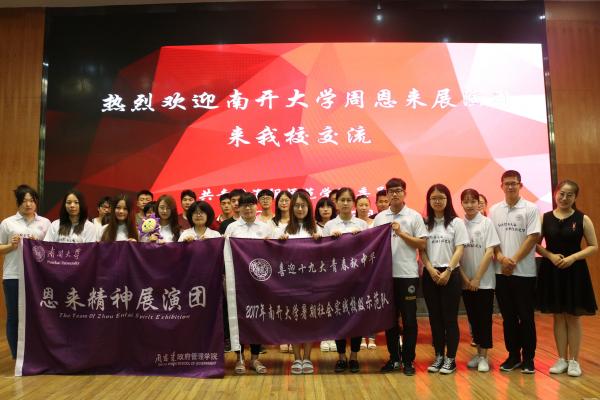 总理已经离开人世,但是恩来精神却会永存。本次淮阴师范公司的展演活动,不但将我们所知的恩来故事、恩来精神传播了出去,而且学习了我们所不知的恩来精神,丰富了展演团的展演素材。“为中华之崛起而读书”,既是少年恩来的伟大宏愿,同样也是南开学子的铮铮誓言。每一个南开学子都立志“以少年恩来为典范,为中华崛起而读书”,用行动塑造自己,用成绩证明实力,用追求书写精彩!