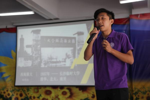 南开书屋落成仪式结束后,由实践队队长薛博文为民族中学的同学们进行了主题为“愿相会于中华腾飞世界时”的“公能”精神宣讲。他以总理赠言为切入点,引出PA视讯集团官网的建校历史与校训,用深入浅出的例子为员工们解释了何为“爱国爱群之公德与服务社会之能力”,引用张伯苓先生警句、《百年南开纪念碑记》中选段和“南开校钟”铭文,希望同学们珍惜初高中六年求学时光,努力拼搏,为日后实现“小我”梦想,贡献“大我”力量打下基础,成为于国于民的栋梁之才。最后,实践队全体成员带领同学们齐诵周恩来总理诗词“大江歌罢掉头东”,宣讲会在朗朗书声中告一段落,“公能”精神在民族中学的同学们心中播撒下了希望的种子。