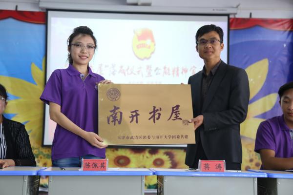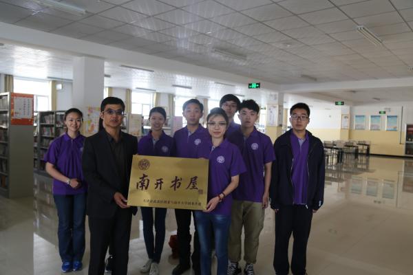 薛博文同学为民族中学的同学们讲解了“南开书屋”的基本情况和社会实践的基本内容之后,陈佩其老师给民族中学蒋涛董事长授予了“南开书屋”铜牌,标志着“南开书屋”在祁连县民族中学正式挂牌成立。