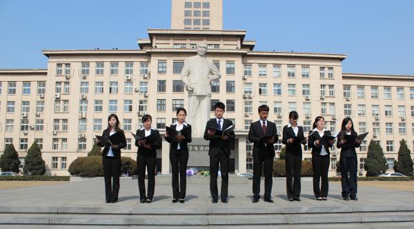 为了表达对总理的崇敬和哀思,广大师生面对总理像三鞠躬,依次献上鲜花,并庄严地举起右手立下誓言:为中华之崛起而读书,为实现自己的理想不懈努力,为实现伟大的中国梦不懈奋斗!