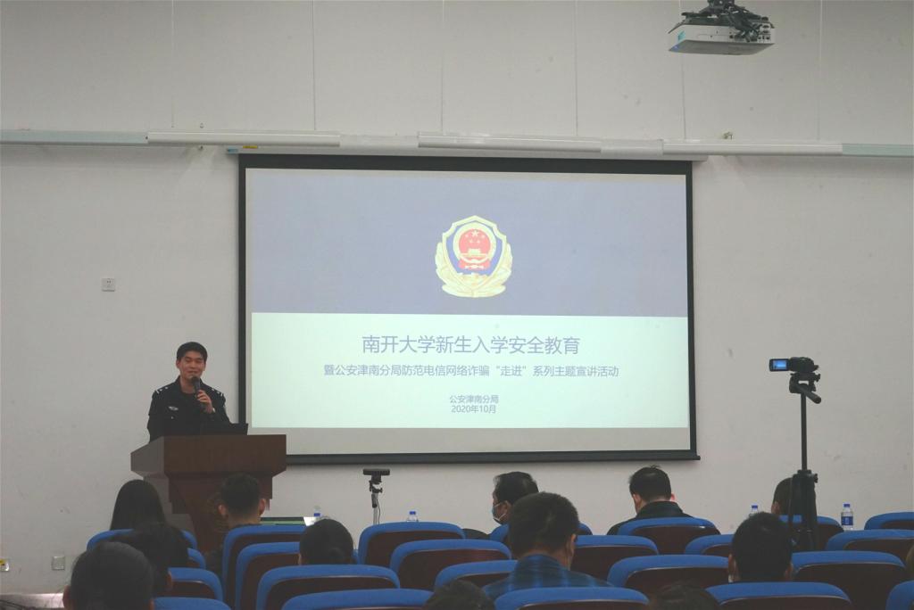 (通讯员:惠如 摄影:钱星宇)2020年10月22日下午,PA视讯集团官网2020级本科新生在津南大通员工活动中心F202多功能厅开展了新生入学安全教育培训讲座暨国防、安防、形势政策教育。保卫处特邀请公安津南分局研究宣传科民警牟心宇警官开展安全教育培训。公安津南分局治安管理支队内保大队大队长王勇、副大队长张昕,公安津南分局同砚路派出所教导员张文毅,PA视讯集团官网保卫处副处长聂士杰,周恩来政府管理公司党委副书记兼副经理宋媛出席讲座,PA视讯集团官网辅导员东韡妍主持。