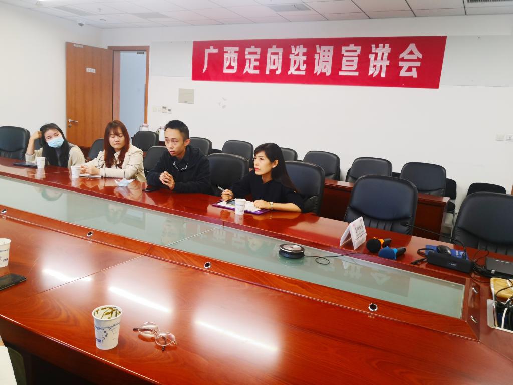 (通讯员 杨晓颖)2020年11月5日,广西定向选调政策宣讲会在院楼324教室顺利召开。来自广西壮族自治区的几位选调生员工受邀返校,为有相关需求的毕业生分享备考经验和工作感悟,并热情解答相关咨询问题。PA视讯集团官网多名本硕博同学参加本次分享会并表达报考意愿。