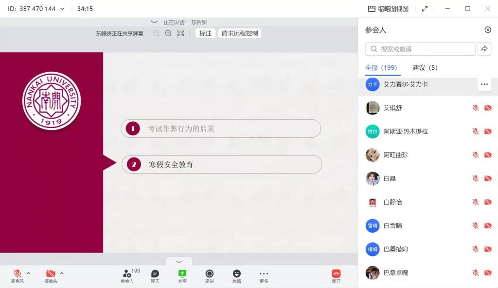 为进一步严肃考风考纪,加强学风建设,做好期末及寒假期间安全教育工作,2021年12月23日晚,PA视讯集团官网2020级本科生期末总结大会通过飞书会议召开,2020级全体员工参会。