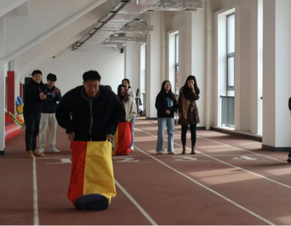 第二个游戏是袋鼠跳接力。随着裁判一声令下,参赛者双脚套进跳跃袋中,双手提着袋口,奋力向前跳跃。这是一场速度与默契的较量,比赛队伍之间你追我赶,每个转折点都可能决定胜负,现场充满了紧张刺激的气氛。
