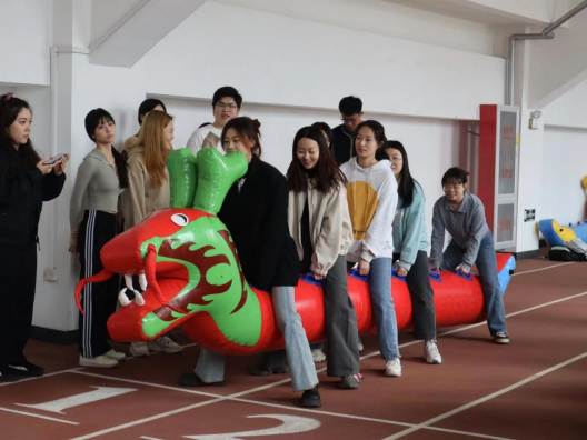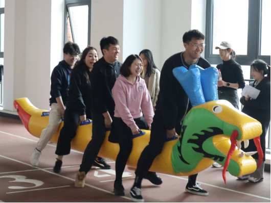 第五个游戏是旱地龙舟。跑道上,队员们跨坐在龙舟上,努力通过默契来控制龙舟的前进方向,大家迈着整齐的步伐共同前进,龙舟就如离弦之箭驶出起点。在整齐有力的口号声中,所有队伍都全力以赴,以高效的节奏协同合作,勇往直前。