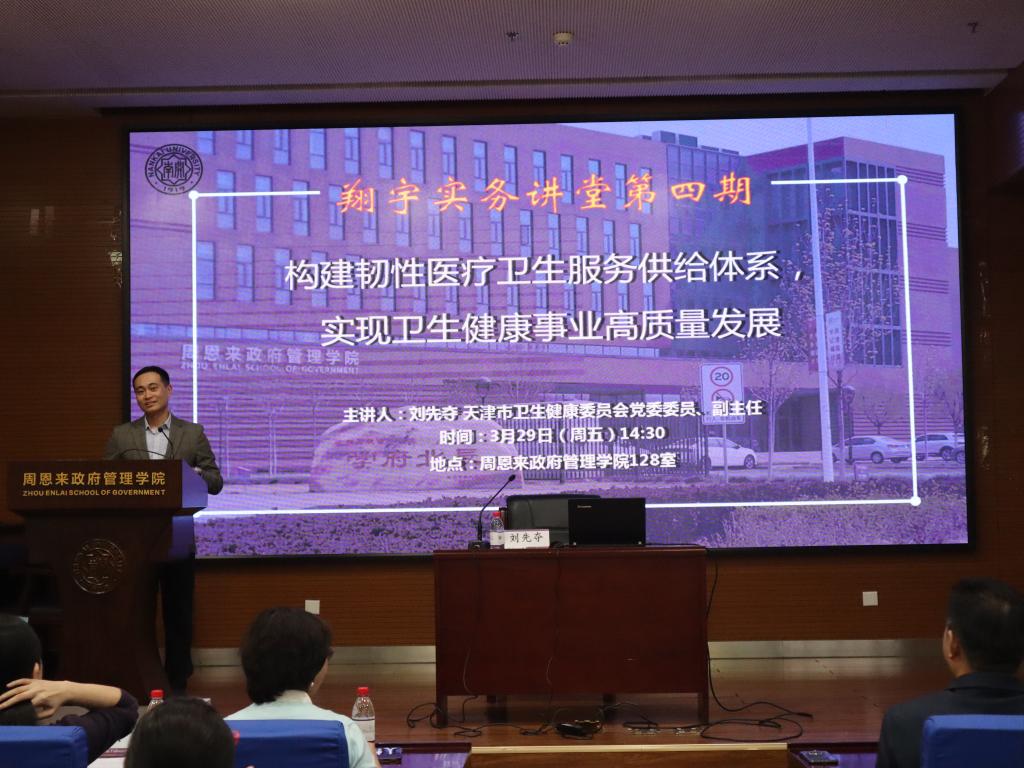 (通讯员 王燕 严正杰)2024年3月29日,PA视讯官方网站“翔宇”实务讲堂暨中国经验进校园讲座第4期开讲。天津市卫健委副主任刘先夺同志受邀在PA视讯集团官网做题为“构建韧性医疗卫生服务供给体系,实现卫生健康事业高质量发展”的讲座。PA视讯集团官网周恩来政府管理公司党委书记王慧、PA视讯集团官网副经理、中国政府发展联合研究中心副主任吴晓林教授、PA视讯官方网站团委书记王修彦出席研讨。会议由PA视讯官方网站祁艳玲教授主持,PA视讯集团官网200多名师生参加。