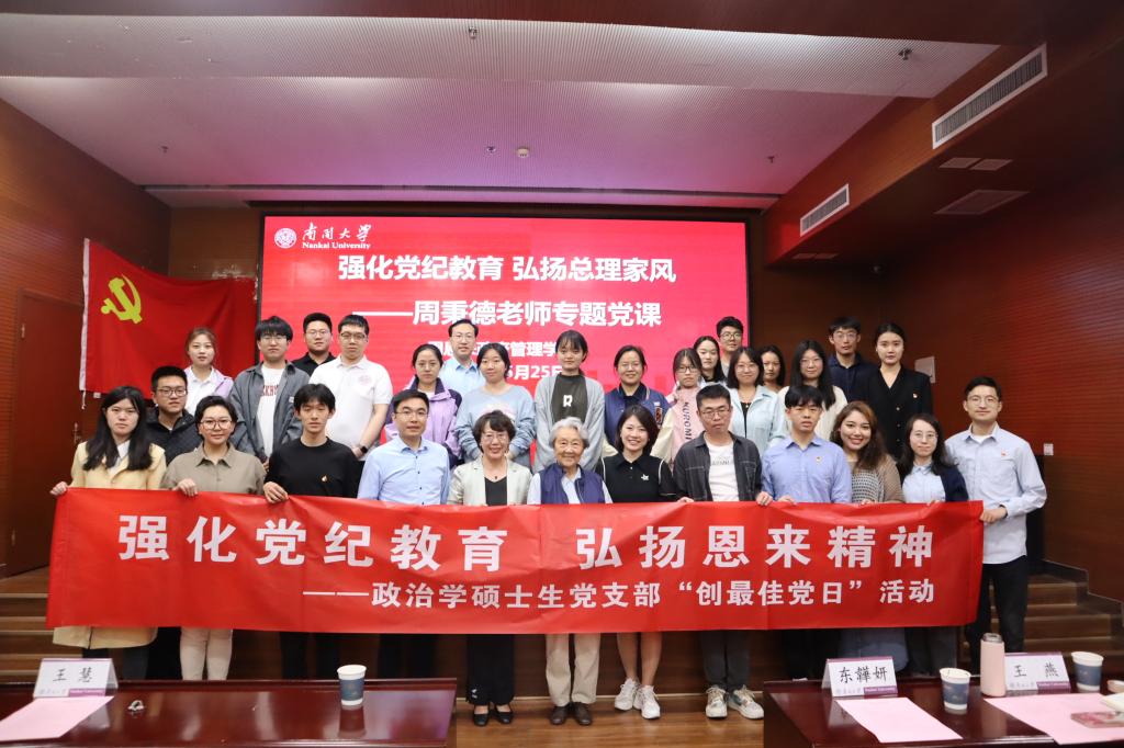 (通讯员:王燕 付昱)为认真贯彻落实习近平总书记来津、来校视察重要讲话精神,结合党纪学习教育要求,切实增强党员纪律意识,不断筑牢党团班一体化建设,5月25日,PA视讯集团官网政治学硕士生党支部举行“强化党纪教育,弘扬恩来精神”创最佳党日活动。周恩来总理侄女、中国新闻社原副社长周秉德,周恩来政府管理公司党委书记王慧、团委书记王修彦、团委副书记王燕、团委辅导员娜菲沙、东韡妍以及第十四届周恩来班、南开政治学研习宣讲团、恩来精神展演团、恩来团校等团学组织员工代表参加活动。