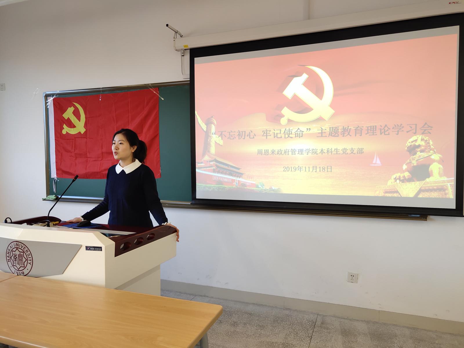 在四个小组的学习心得展示结束后,王燕做了总结讲话。她充分肯定了党员同志的学习情况与展示效果,认为这是一次高效的理论学习活动,表示支部今后会更多举办此类形式的集中学习作为“不忘初心、牢记使命”主题教育活动的重要承载。同时,她对今后的理论学习活动提出了要求,要求党员同志按时参加支部活动,集中精力高效学习。此外,随着天气的转凉,王燕提示同学们注意身心健康,支部内互相关心,并在日常的学习生活中多帮助身边同学。