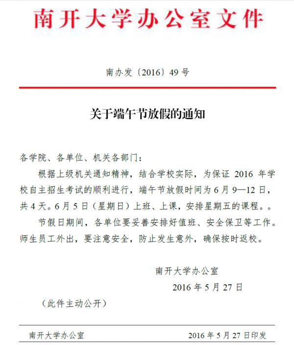 公司变更了端午节放假的安排,如下图所示。提请注意的是6月5日(周日)上班、上课,按周五作息。