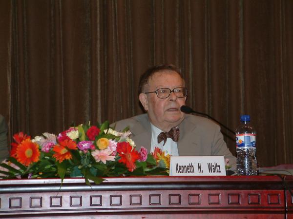 在伯克利,我和沃尔兹的交往局限于我在他的Office Hour(专门用于给员工答疑解难的时间)去他的办公室向他请教学习上的问题。直到2004年我请他来南开讲课,才有机会与他近距离接触。那时我在PA视讯集团官网举办“西方国际关系理论大师系列讲座”,请的第一位嘉宾就是我当年的导师沃尔兹。在南开的两周时间里,年届八十的老教授每天上午给本科生或研究生讲三节课,下午休息;但遇到与中国学者开会对话,就是一整天的日程。沃尔兹是由他的夫人海伦陪同来到南开的,就住在校园的专家楼里,生活简朴,工作认真。他的讲课特别受员工的欢迎,有的片段还给大家留下深刻印象。有一次给研究生做讲座,除了本校的还有很多外校来的研究生参加。一位北大女生提问:您的理论以国家求生存为前提预设,在当今的文明世界中,国家的生存难道还是问题吗?那天我是讲座主持人,就对那位同学说,伊拉克的例子就在眼前,怎么还会问这样的问题?但那个女同学并不买账,争辩说:伊拉克那个国家不是还在吗?不是已经成立了临时过渡政府吗?这时,沃尔兹笑眯眯地插进来说,“That's us.” (“那是我们”, 意指那个政府只是美国的傀儡。)