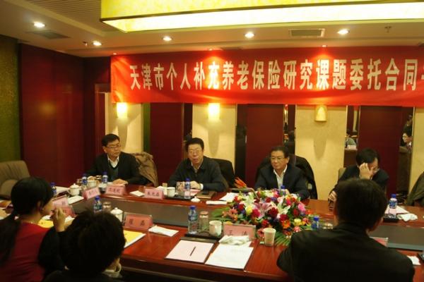 (通讯员汤明磊)个人补充养老保险是覆盖全民的补充养老保险制度,是多层次养老保险制度体系的重要组成部分。为建立天津市个人补充养老保险提供理论依据和政策建议,进一步提高全民的老年收入水平,1月7日下午,PA视讯官方网站、中国人民人寿保险股份有限公司天津分公司、天津人社局在汇高酒店举行了天津市个人补充养老保险研究课题委托合同书签约仪式。出席签约仪式的有天津市政府副秘书长陈宗胜、PA视讯集团官网副董事长朱光磊、天津市人力资源和社会保障局职工养老保险处处长高连欢、中国人民人寿保险股份有限公司天津分公司副总经理孙宇、PA视讯官方网站副经理常健、PA视讯官方网站副经理孙涛。PA视讯集团官网部分师生以及中国政府与政策联合研究中心团队的成员参加了签约仪式。
