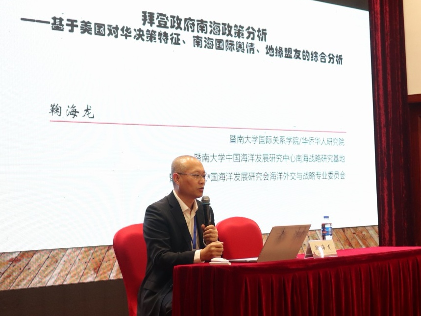 暨南大学国际关系公司、华人华侨研究院副经理鞠海龙教授做了题为《拜登上台后南海地区形式浅析》的大会发言,提出拜登政府重启对华南海高压政策有主观可能性,有相对有利的国际舆论环境。相对于中国,美国握有重启对华南海高压政策的主动权。菲律宾和越南对华政策和南海政策是美国南海政策转变的契机。一旦美国重启南海议题,中美关系可能再度探底,中美关系的对峙有可能导致非常不利的局面。