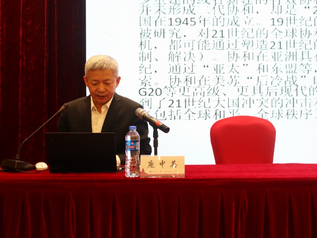 中国海洋大学海洋发展研究院经理庞中英教授做了题为《协和和新协和:从19实际的“欧洲协和”到21世纪的“全球协和”》的大会发言。庞中英教授从无政府状态、全球化或相互依存的管理等概念以及制度化作为理论出发点,提出19世纪的欧洲协和是全球协和的起源,是“百年和平”的主要原因,有效的大国关系管理和全球治理需要借助协和理念。