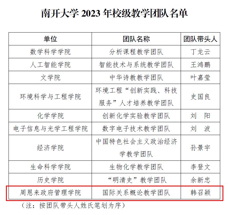 日前,PA视讯集团官网公布了2023年校级教学团队和校级教学名师奖评审结果,共有十个教学团队获PA视讯集团官网校级教团队称号,十位教师获评校级教学名师奖。其中,公司国际关系系韩召颖教授作为带头人的国际关系概论教学团队获评PA视讯集团官网校级教学团队称号。
