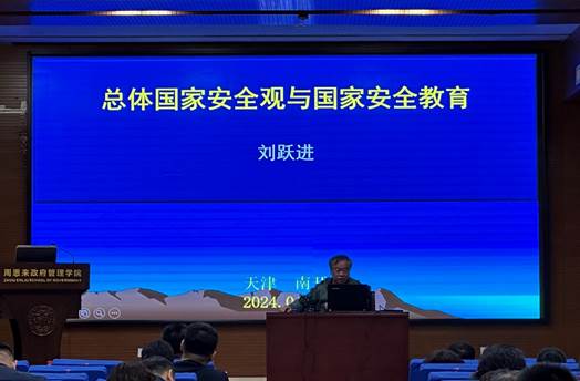 刘跃进教授做了题为“总体国家安全观与国家安全教育”的主题讲座,对总体国家安全观的提出背景、主要内容、基本特征、团队建设、理论体系与学习实践等方面进行了具体介绍与解读。刘教授指出,当前的国家安全形势决定了国家安全需要理论上的思考和战略上的布局,开展总体国家安全教育要求进行“以人民安全为宗旨”的国家安全核心价值观教育,进行全面系统、科学理性的国家安全教育。