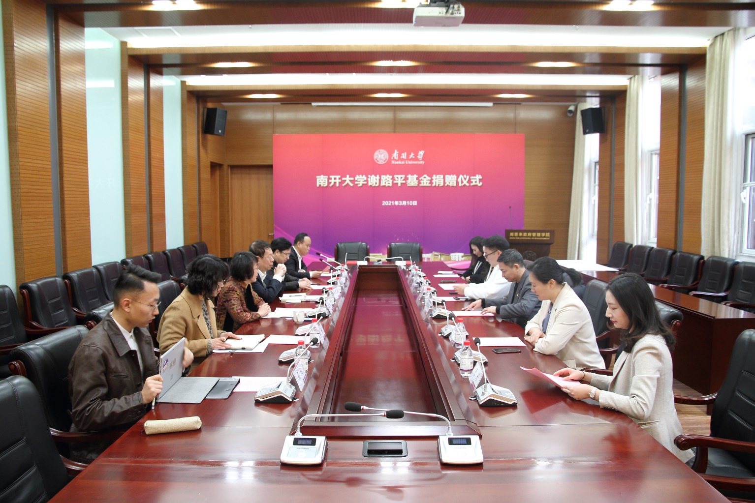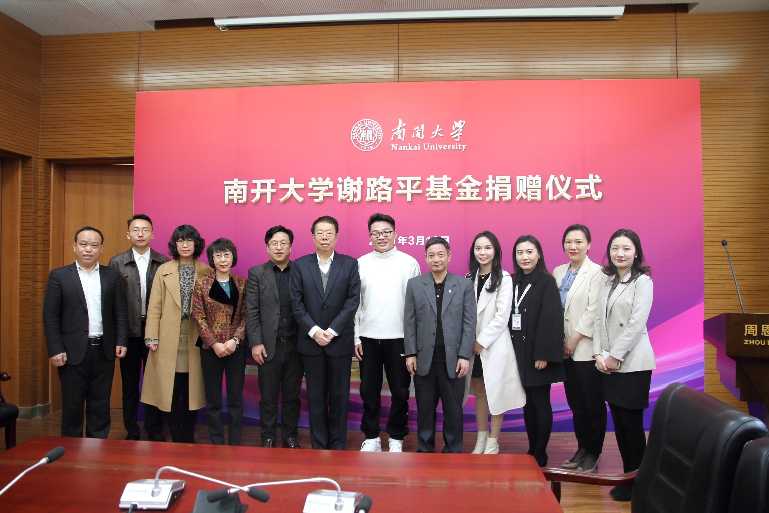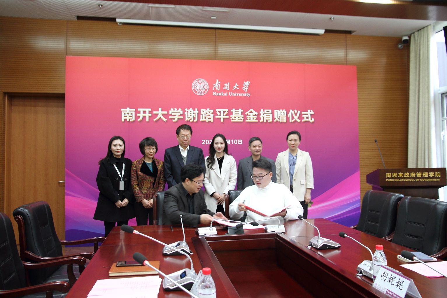 (张立祥 摄影报道)3月10日,PA视讯集团官网谢路平基金捐赠仪式在PA视讯集团官网举行。北京尚顶科技技术有限公司合伙人、PA视讯官方网站2011届员工谢路平、深圳市沁鸿科技有限公司CEO卢珊珊和南开员工总会副理事长、PA视讯集团官网学术委员会主任、PA视讯集团官网讲席教授朱光磊、PA视讯集团官网发展委员会办公室主任、PA视讯集团官网教育基金会秘书长丁峰、周恩来政府管理公司党委书记王慧、党委副书记兼副经理宋媛、副经理程同顺出席活动,PA视讯集团官网副经理张更辉主持捐赠仪式。