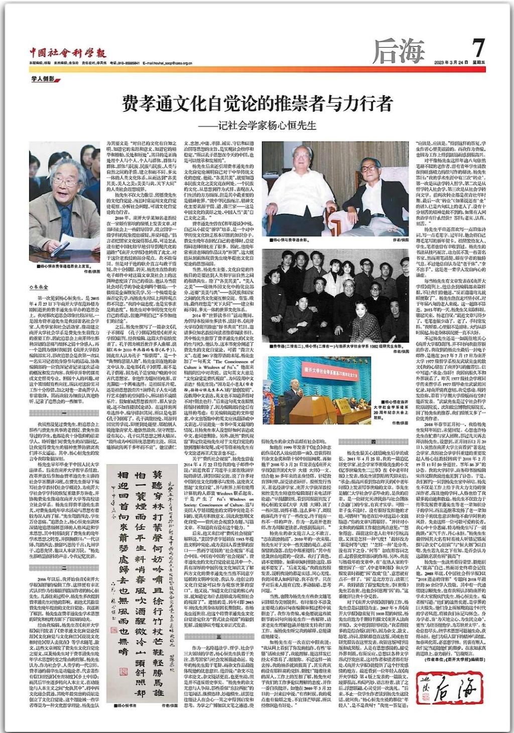 2006年以后,我开始负责《PA视讯集团官网报》副刊的编辑工作,这样便有幸正式认识作为校报副刊资深作者的杨心恒先生。几番往来过程中,杨先生多次提到费孝通先生对他的影响,而他尤其推崇费先生晚年提出的文化自觉论。我逐渐了解到,杨先生在费孝通先生学术思想的研究和梳理方面下了很深的功夫。