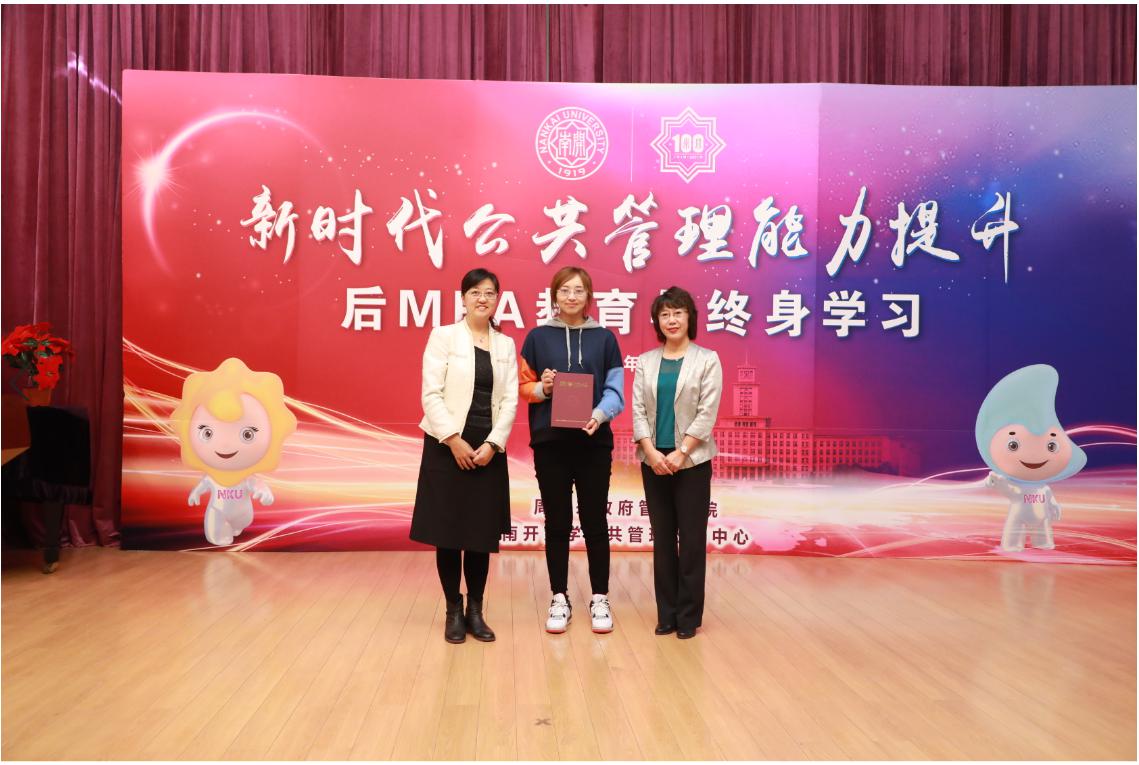 王慧为获得全国公共管理(MPA)优秀学位论文的作者及导师颁发证书。